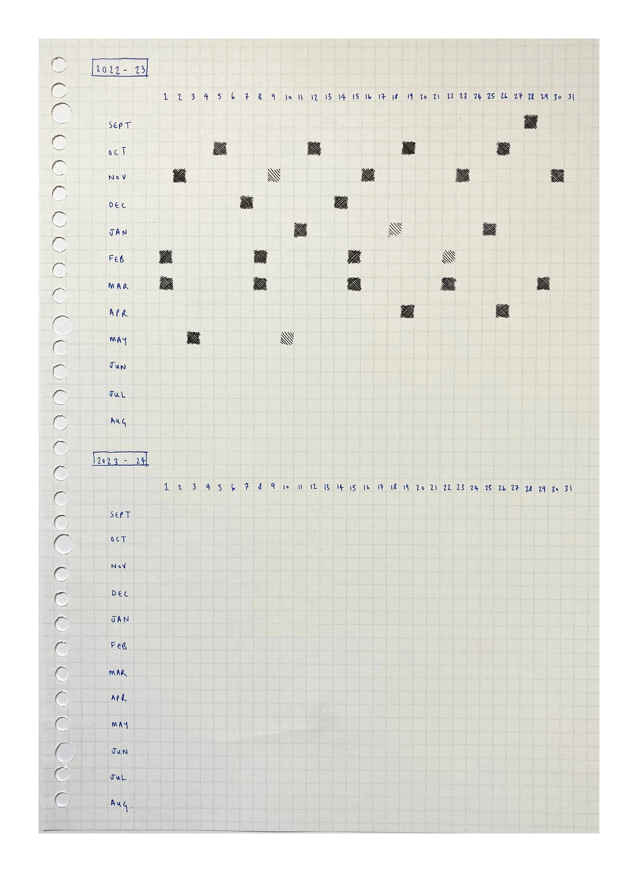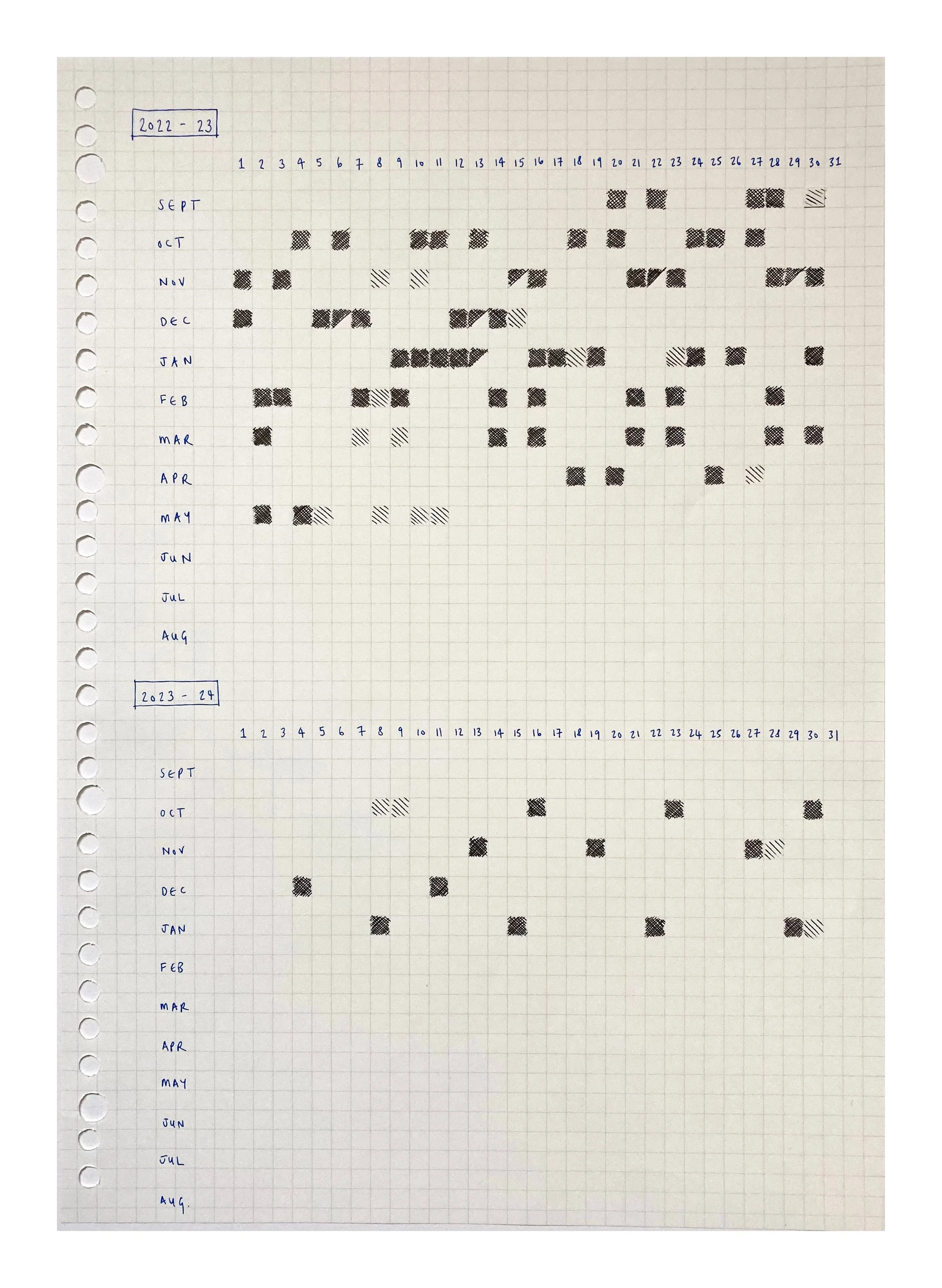 Diagrams mapping changing work offers from one year to the next for a group of hourly paid lecturers working on the same BA course (at a UK university).